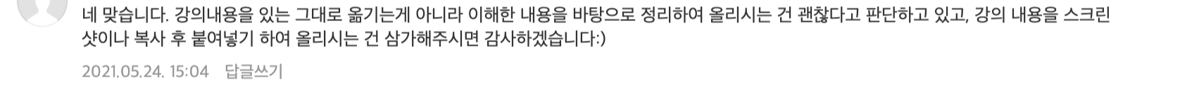 또한, 카페에서 질문을 올려 코드잇 강의를 들으면서 정리한 내용을 올려도 된다고 확답을 받았으므로 블로그와 github에 따로 정리한 내용을 올려봐야겠다.