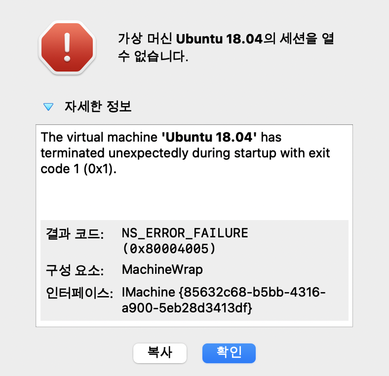 VirtualBox를 실행해서 우분투를 연결할 때 위와 같은 오류가 뜰 수가 있다.