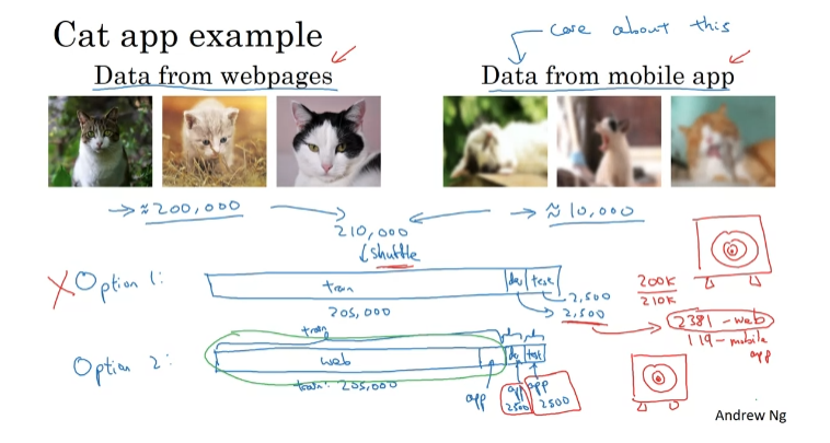 Option1: 모두 섞고 테스트한다. 웹 이미지 최적화에 많은 시간을 쏟아야 해서 추천하지는 않는다. 다른 데이터 분포에 맞춰 개발 세트를 최적화하게 하는 것이기 때문.