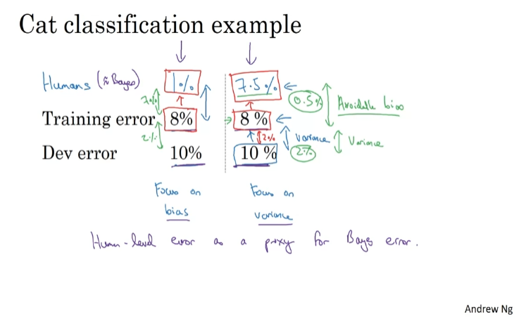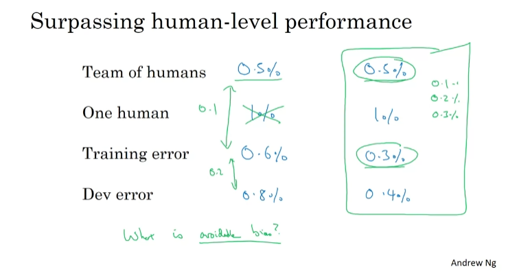 Human-level error는 Bayes error를 추정할 수 있게 해준다. => bias / vairance를 줄일지 결정 => Human-level performance를 넘기 전까지 잘 작동 => 이후로는 Bayes error 추정값을 구하기 어려워 의사결정에 어려움이 있을 수 있음