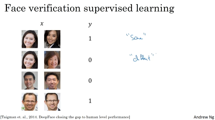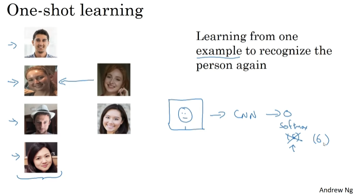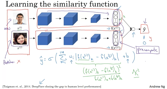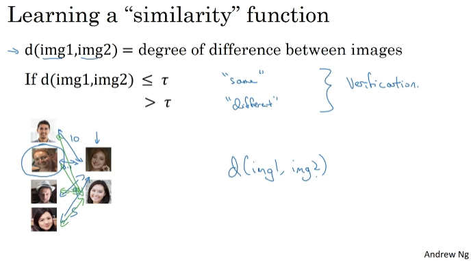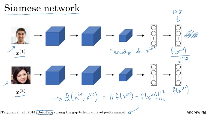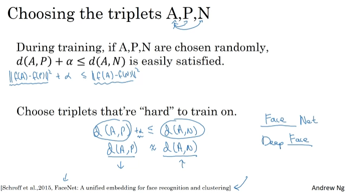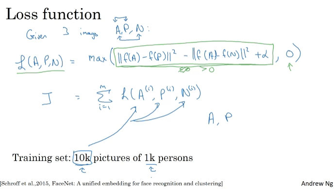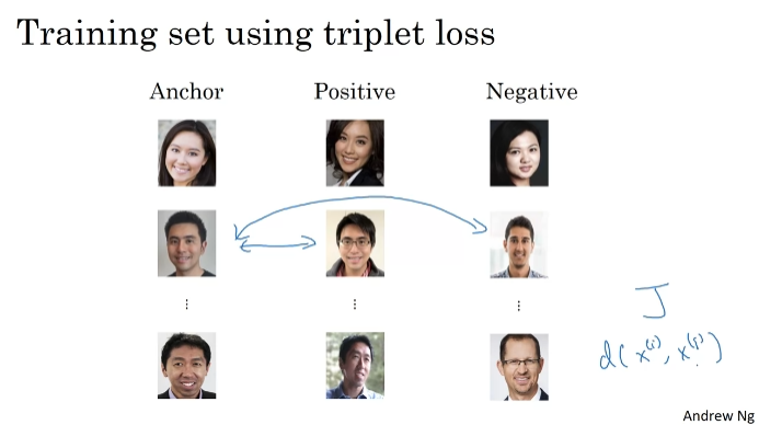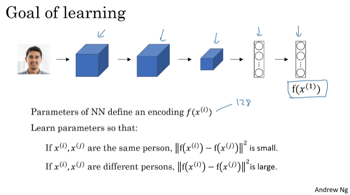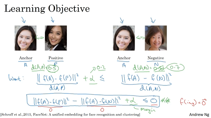 신경망의 parameter를 학습하는 한 가지 방법은 삼중항 손실함수에 경사하강을 정의하고 적용하는 것이다. 이는 얼굴사진에 좋은 인코딩을 제공한다.