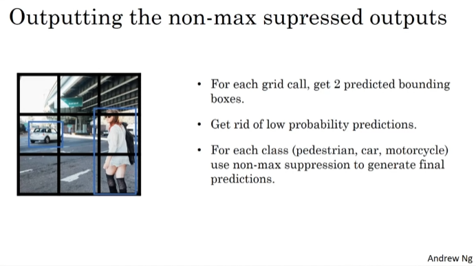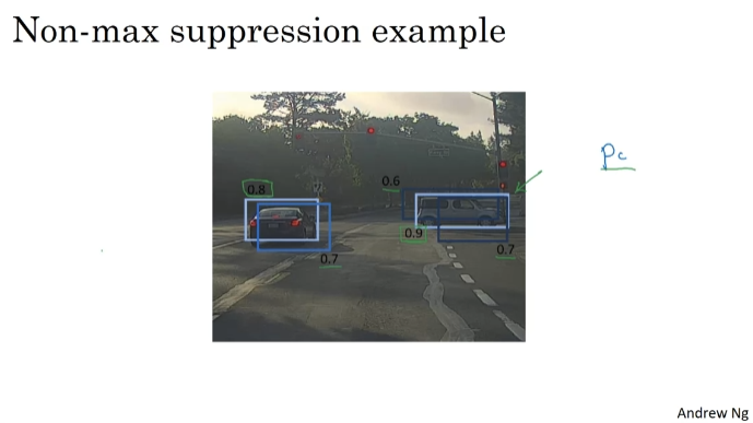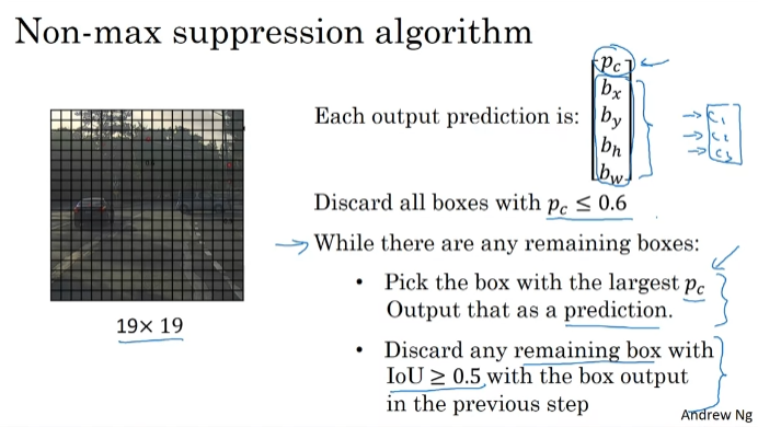 각 객체에 대해 여러 탐지가 일어날 수도 있다. Pc를 감지될 가능성이라 한다. 확률이 낮은 박스를 non-max 억제한다. 출력 객체 당 한 번씩 실행한다.