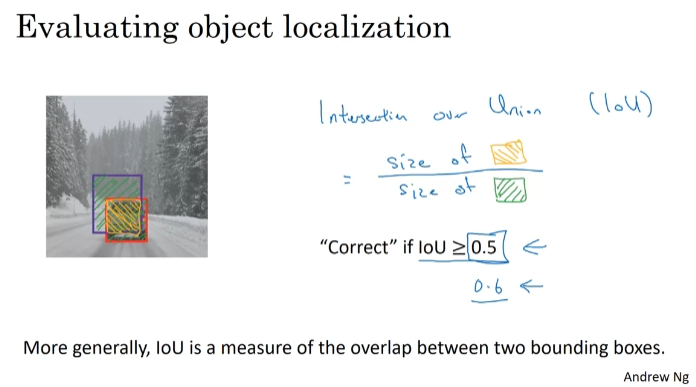 IoU. 합집합에 대한 교집합을 계산한다. 교차점의 크기를 계산한다. 판별기준으로 0.5가 관습적으로 사용된다.