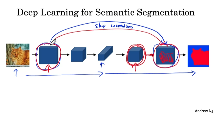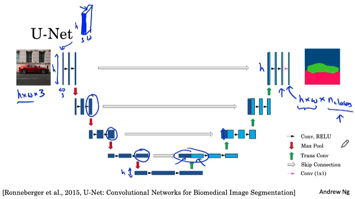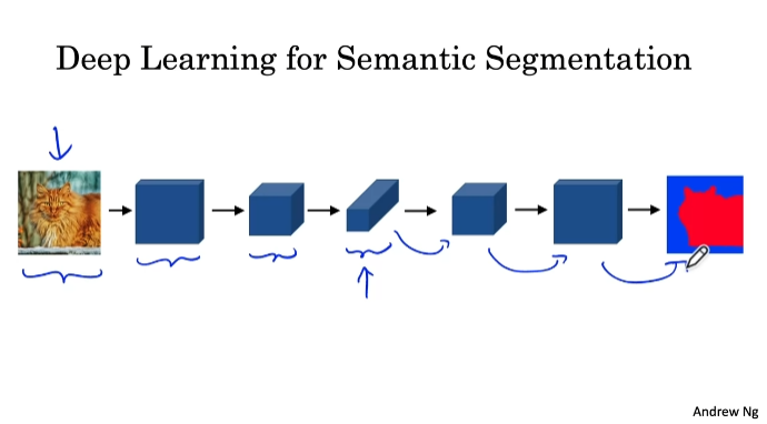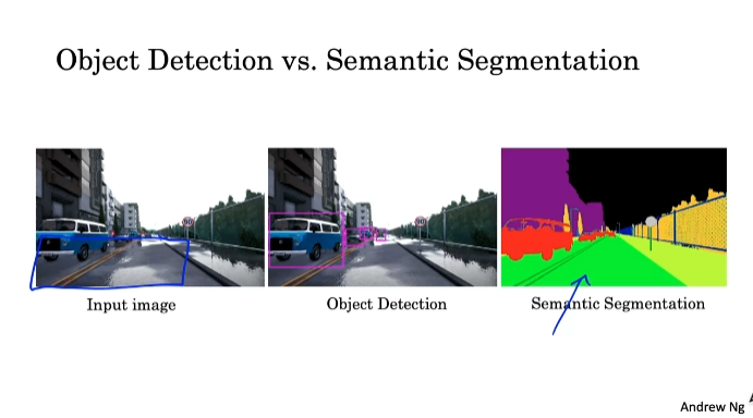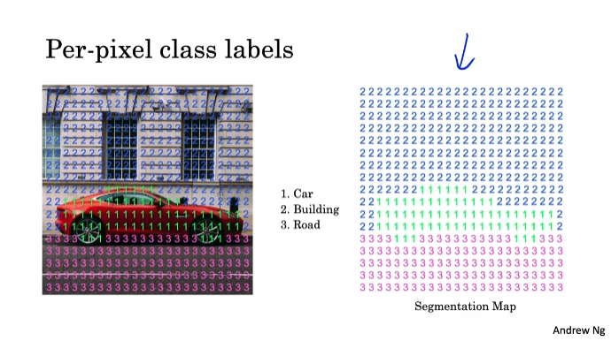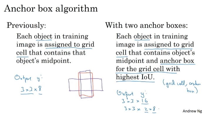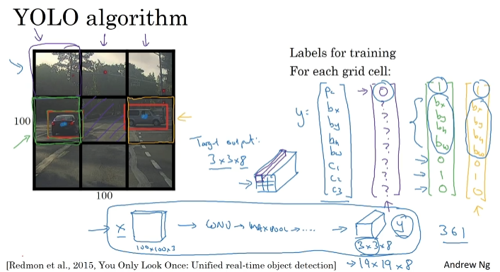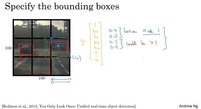 p_c : 객체가 있을 가능성. bx, by, bh, bw가 박스를 결정한다. c1은 보행자, c2는 자동차, c3는 자전거를 의미한다(0,1,0). p_c가 0일 경우 객체가 없는 것이므로 경우 나머지는 신경쓸 필요가 없다.