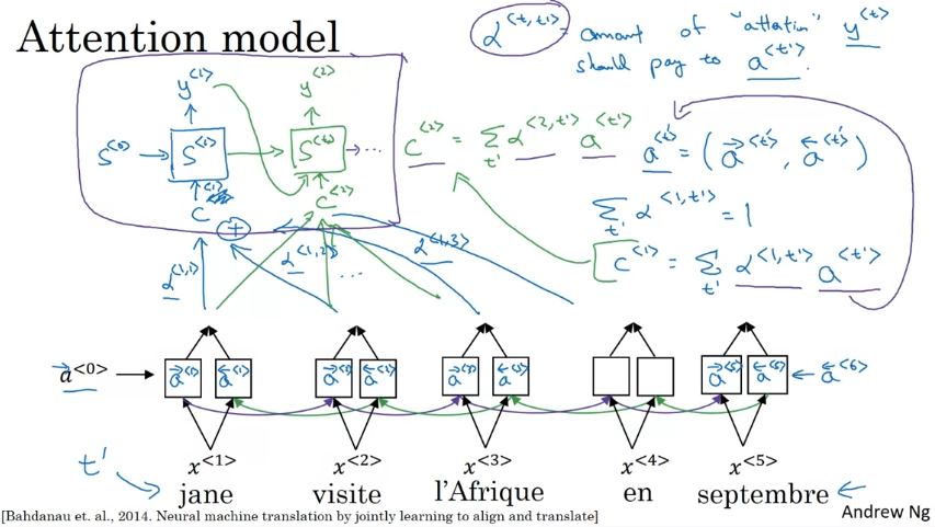 양방향 RNN으로 각 입력 단어에 대해 몇 가지 특징을 추출한다. EOS를 만나기 전까지 한 단어씩 만들어내는 RNN의 순방향 생성이며 알파<t,ti>라는 어텐션 가중치가 있다.