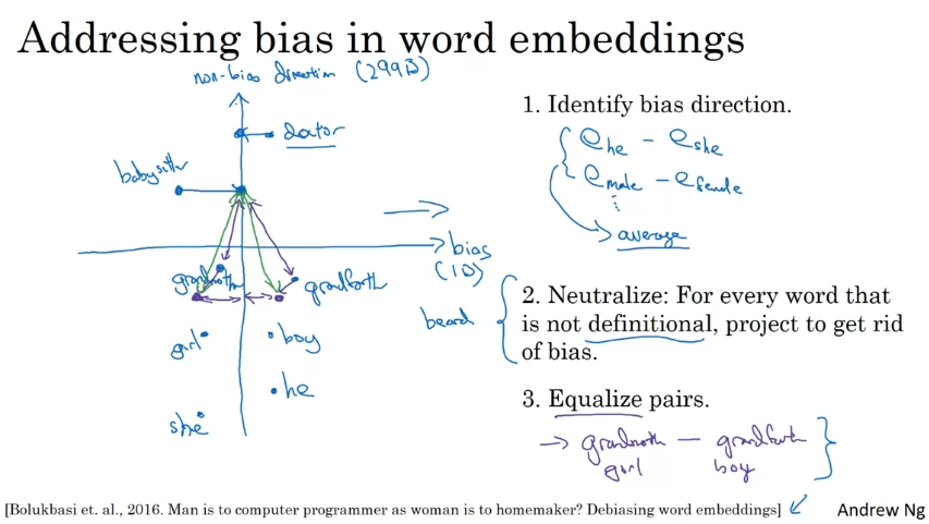 임베딩 벡터 빼서 평균을 내기. 계산 결과가 편향임. 편향 방향은 10차원 부분 공간, 비편향 방향은 299차원 부분 공간이다. 명확하지 않은 단어를 없애서 편향을 없앤다.명확한 단어들을 평준화한다.