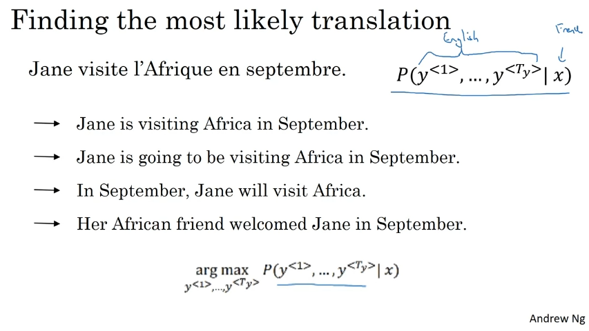 출력을 무작위로 샘플링하기는 싫을 것이다. 무작위로 샘플링하지 않고, 조건부 확률을 극대화하는 영어 문장 y를 찾는 것을 원한다. beam search.