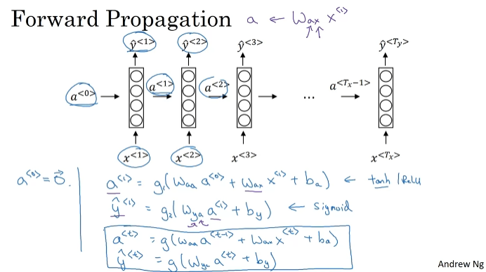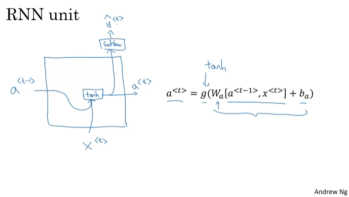 RNN 모델을 빌드한다. y^<1>은 소프트맥스에 따른 출력이고, 그 단어가 될 확률을 예측한다.