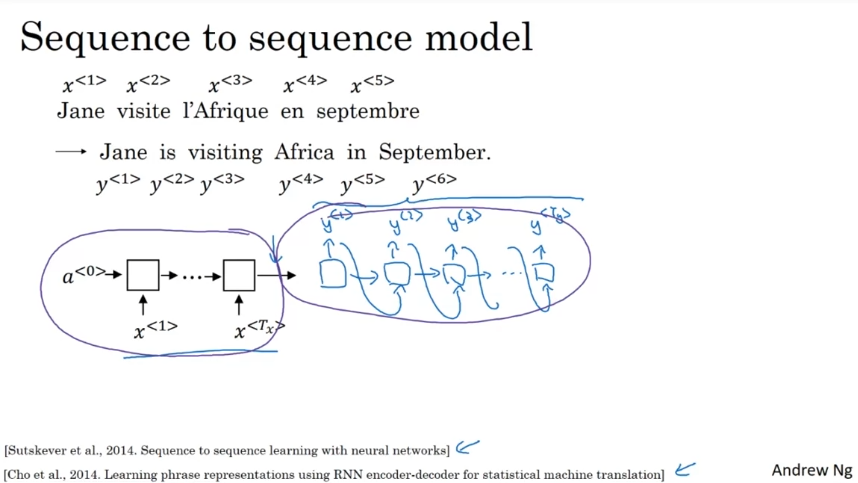 encoder network로 RNN을 수집한 후 decode network로 한 단어씩 번역을 output. 예시로 한 단어씩 넣어서 번역하는 것을 말할 수 있다.