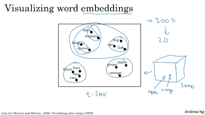 300차원 임베딩을 한다면, 300차원 데이터를 시각화할 수 있도록 2차원 공간에 임베딩 하는 것이다. t-SNE 알고리즘. 유사한 특징 벡터에 매핑.