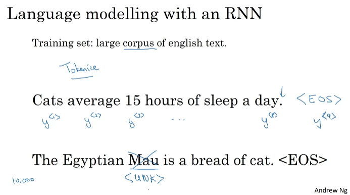 sampling하기 위해서 무작위로 소프트맥스 분포에 따라 표본을 매긴다.(=y^<1>) 방금 샘플링한 값 (y^<1>) 을 입력으로 전달하고(one-hot 인코딩), y^<2>를 예측한다. EOS 토큰을 생성할 때까지 반복한다.UNK가 생성되는게 싫으면 알 수 없는 단어가 아닌 단어를 얻을 때까지 나머지 어휘와 리샘플링을 유지한다. 단어 수준의 샘플링