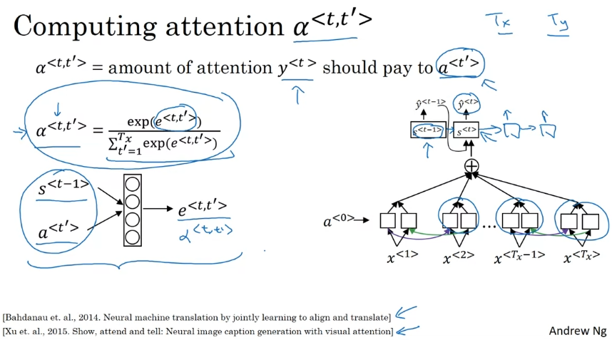 어텐션의 가중치 설정하는 방법. 소프트맥스 우선순위 활용. t' 활성화에 얼마나 주의를 기울일지 결정하고 싶다면 가장 신경 쓸 것은 이전 시간 단계의 은닉 상태 활성화이다. 어텐션 가중치 합이 1이 되게 한 다음 느리지만 한 번에 한 단어를 생성하도록 한다.