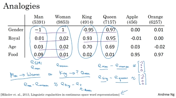 사전의 모든 단어를 이용하여 특징적인 표현을 배운다면 좋지 않을까? 각각의 특징과 값을 학습하기 위해서. 위 그림에서 단어들과 연관된 성별을 알고자 한다. 추가로, orange와 apple은 실제로 비슷한 값들을 가지고 있음을 확인할 수 있다.