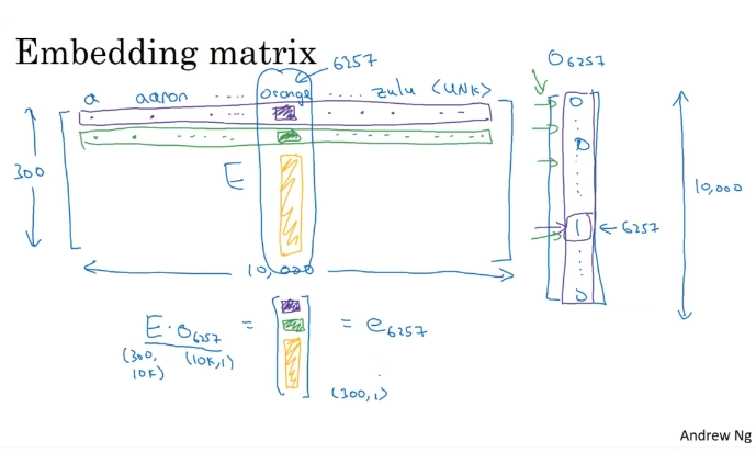 임베딩 행렬E를 hot vecor o와 곱하면 300차원 벡터가 된다.
