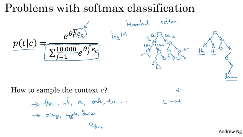 context c를 어떻게 결정하는가? 무작위로 가져오기. 자주 나타난다. a,the,.. 등 일반적인 단어와 일반적이지 않은 단어를 분류하는 것도 필요.