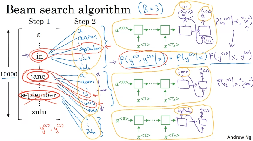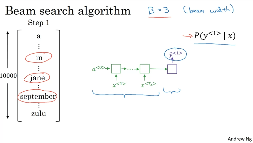 최상의 그럴듯한 문장 출력. 먼저, 첫 단어에 대한 확률 구하기. B라는 매개변수가 있다. B=3이면 세 가지 후보 고려.
