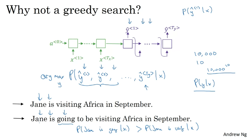 greedy search를 사용하면 안되는 이유. 첫번째 단어로 가능성이 있는 두 번째 모델 선택... 효과가 없다. 한 번에 하나의 단어를 선택하는 것이 항상 최적인 것은 아니다.