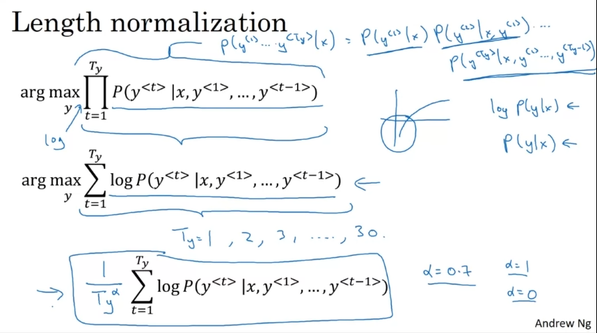 문장이 매우 긴 경우 문장의 확률은 낮아지게 된다. 그래서 로그를 취해서 max를 구하는 대신 평균을 내서 긴 문장을 입력하는 패널티를 줄여준다. 가장 큰 값을 고른다.