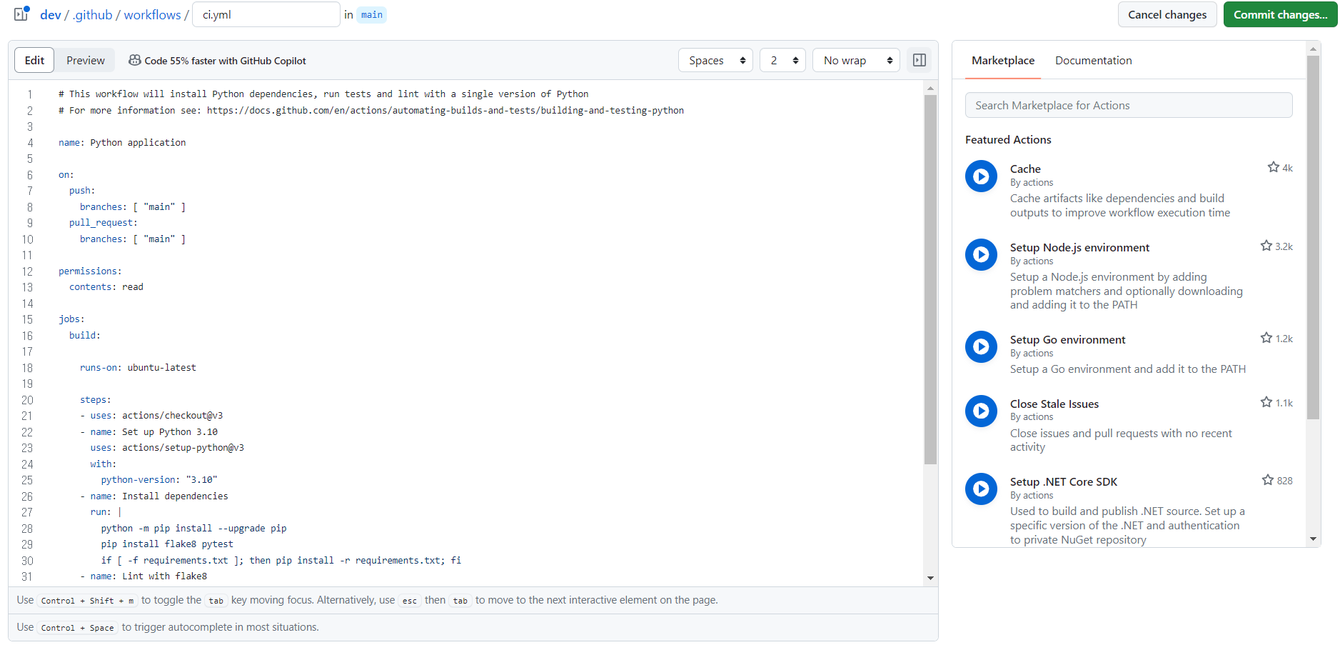 크게 name, on, permissions, jobs로 나누어 작성한다. jobs에서는 최신 ubuntu 환경에서 각 소스 코드를 체크아웃하고 python을 설치하고 종속성을 설치했으며, flake8을 이용하여 코드 린팅을 수행하고 pytest로 테스트를 수행한다.