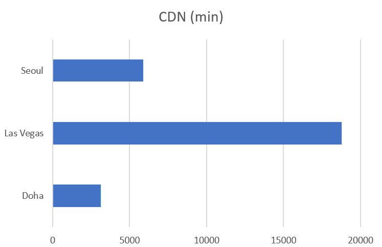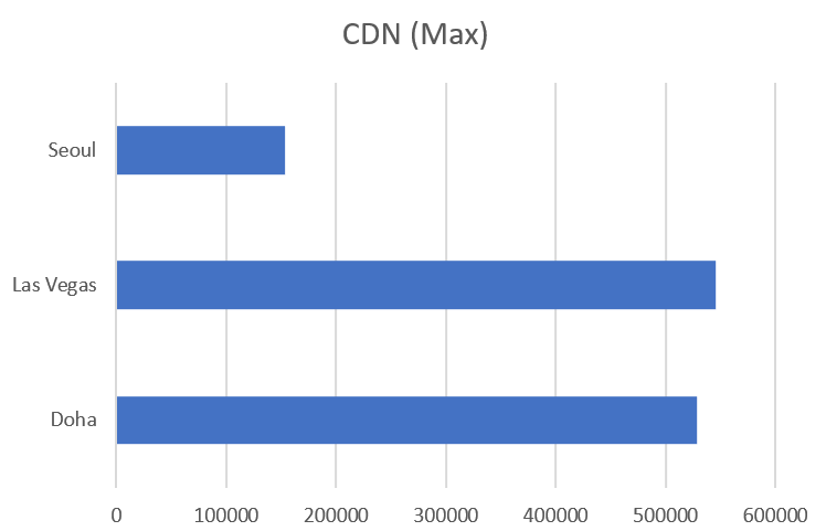 서울(대한민국), 라스베가스(미국), 도하(중동) 지역에 EC2를 만들고 CDN, Americas Storage, Seoult Storage에 접근하여 파일을 다운로드하고 속도(Current Speed)를 기록해보았다.
