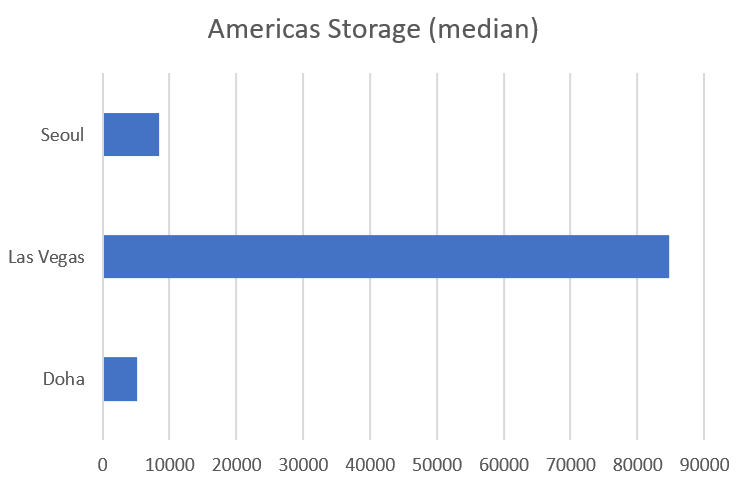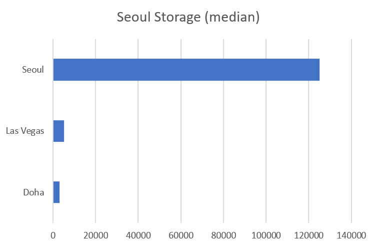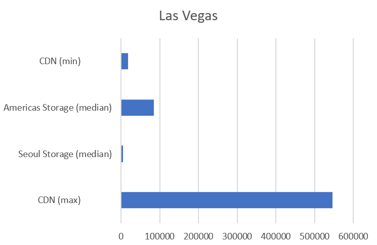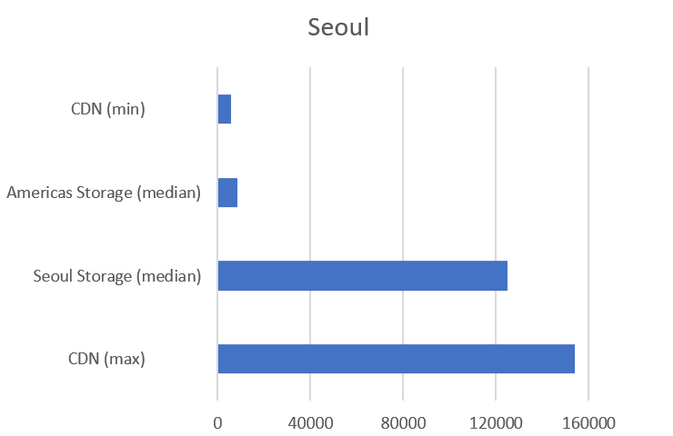 CDN 콘텐츠의 다운로드 최소 및 최대 시간과 미주 Storage 다운로드 속도 중앙값과 서울 Storage 다운로드 속도 중앙값을 비교하였다.