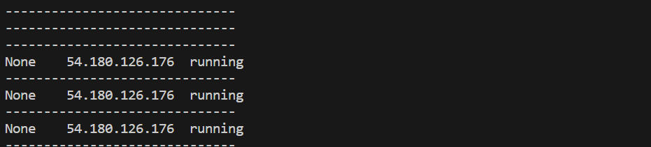 $ while true; do aws ec2 describe-instances --query "Reservations[*].Instances[*].{PublicIPAdd:PublicIpAddress,InstanceName:Tags[?Key=='Name']|[0].Value,Status:State.Name}" --filters Name=instance-state-name,Values=running --output text ; echo "------------------------------" ; sleep 1; done