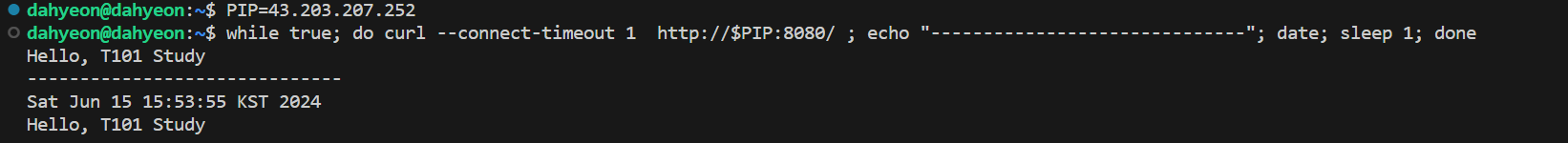 $ while true; do curl --connect-timeout 1 http://$PIP:8080/ ; echo "------------------------------"; date; sleep 1; done