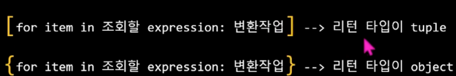 - 결과 값은 for 문을 묶는 기호가 [ ]인 경우 tuple로 반환되고 { }인 경우 object 형태로 반환