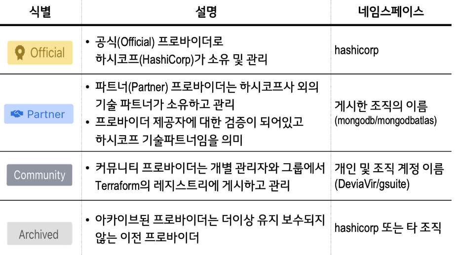 - 네임스페이스 : 지정된 레지스트리 내에서 구분하는 네임스페이스로, 공개된 레지스트리 및 Terraform Cloud의 비공개 레지스트리의 프로바이더를 게시하는 조직을 의미