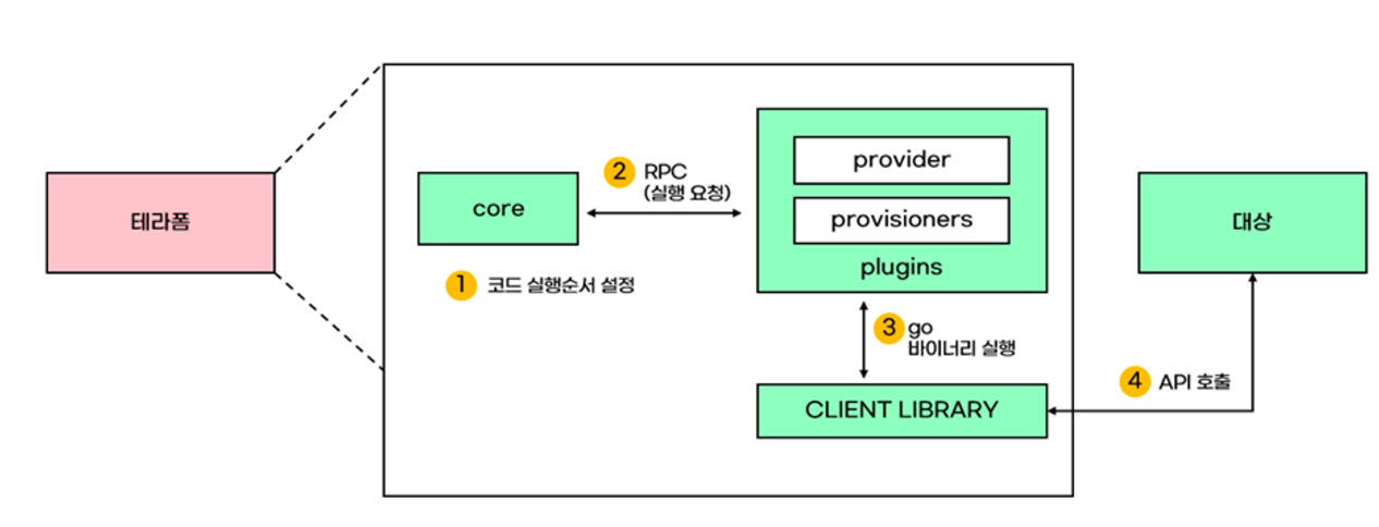 - 테라폼은 terraform 바이너리 파일을 시작으로 로컬 환경에나 배포 서버와 같은 원격 환경에서 원하는 대상을 호출하는 방식으로 실행된다. 이때 ‘원하는 대상’은 호출하는 방식이 서로 다르지만 대상의 공급자, 즉 프로바이더가 제공하는 API를 호출해 상호작용을 한다. 여기서 테라폼이 대상과의 상호작용을 할 수 있도록 하는 것이 ‘프로바이더’다.