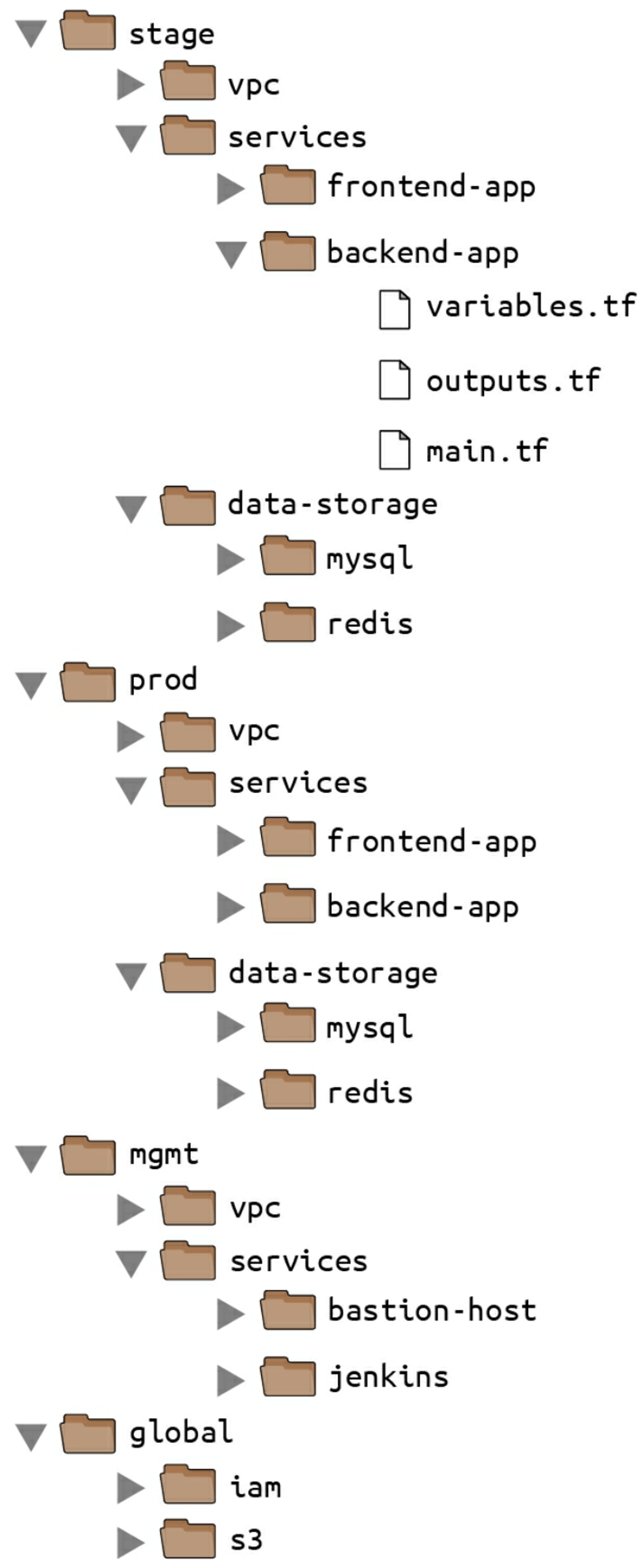 - 각 테라폼 구성 파일을 분리된 폴더에 넣기. (예. stage , prod)