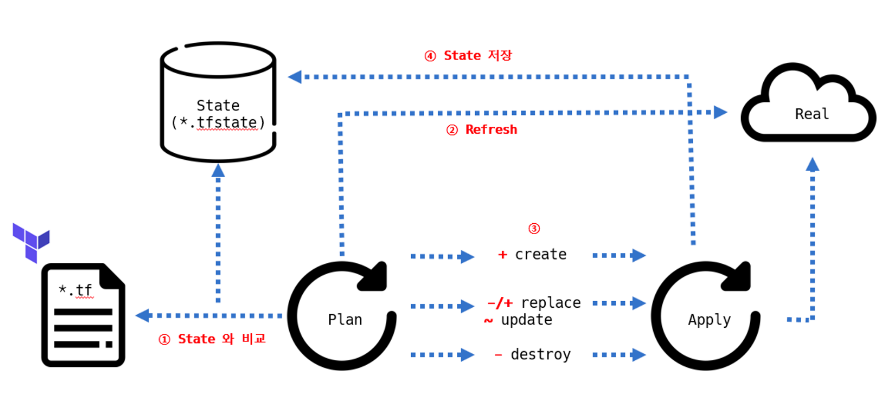 테라폼 구성 파일은 기존 State와 구성을 비교해 실행 계획에서 생성, 수정, 삭제 여부를 결정한다