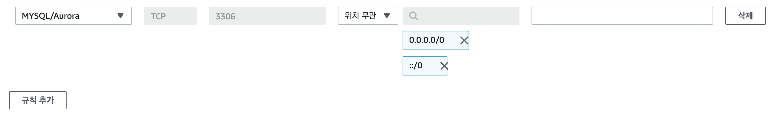 MYSQL 규칙을 추가하고 위치 무관으로 설정해서 어디서나 접근할 수 있도록 한다.