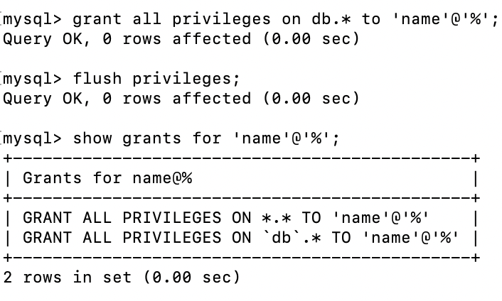 mysql> show grants for 'name'@'%'; # 해당 사용자에 대한 권한을 보여줌
