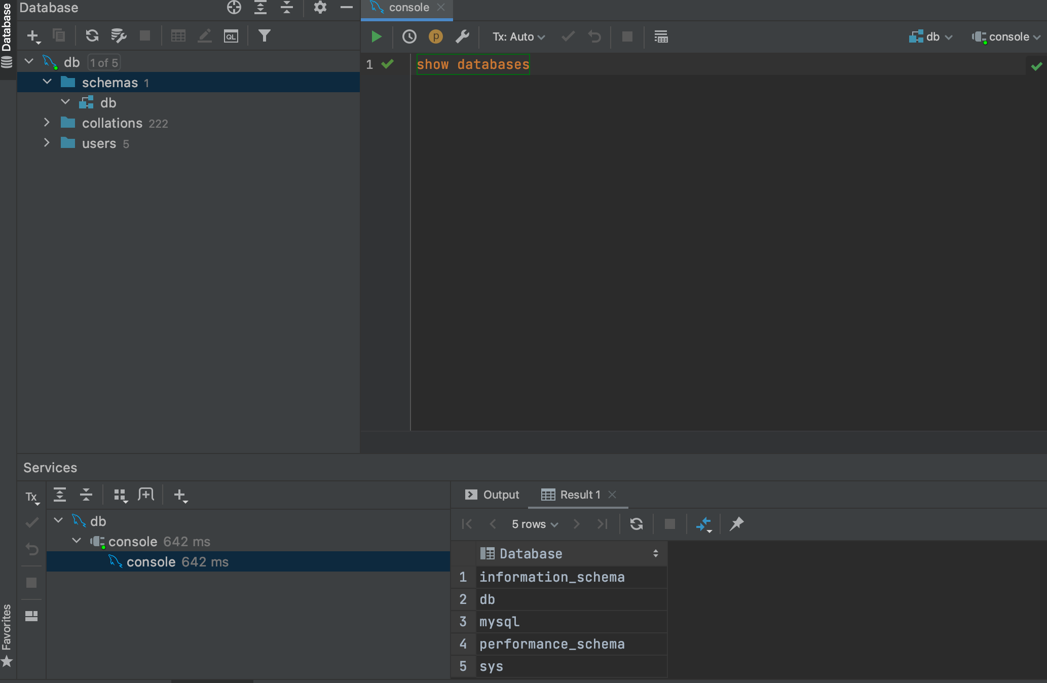 데이터베이스를 확인하기 위해서, 초록색 실행 버튼을 누르면 아래처럼 데이터베이스가 나오는 것을 확인할 수 있다.