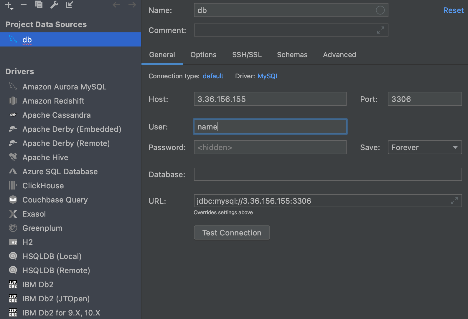 Name, Host (AWS EC2 인스턴스의 공인 ip), port번호(자동지정, 3306), User+Password(mysql의 사용자와 비밀번호)를 입력해한다.