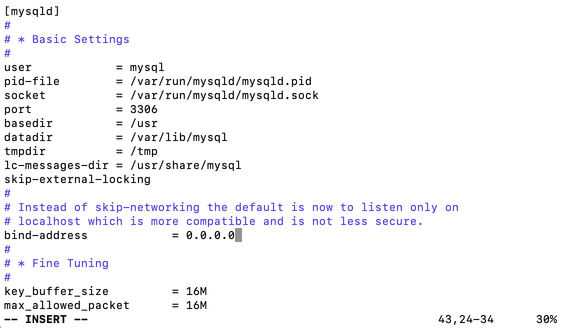 bind-address를 0.0.0.0으로 설정해서 외부 접속을 허용해준다.