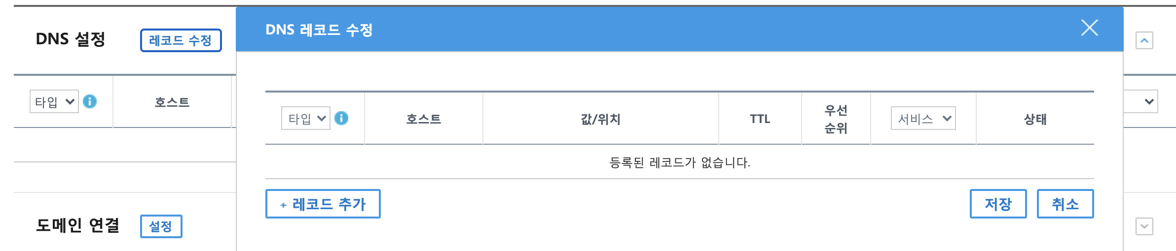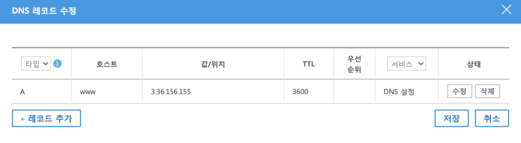 '레코드 수정'버튼을 눌러서 레코드 세팅을 해주고 저장한다.