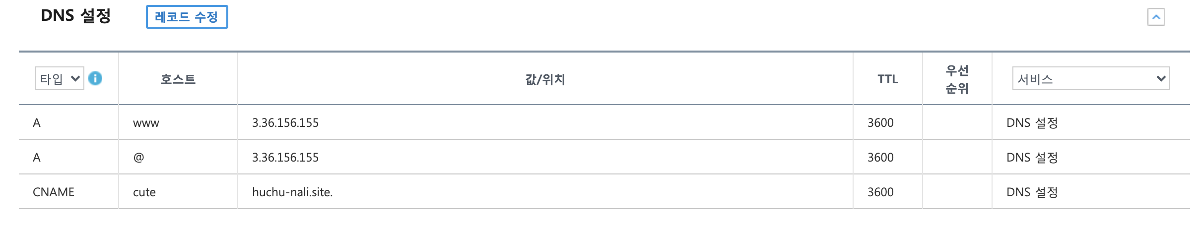 서브 도메인을 적용시키기 위해서 DNS 정보를 설정해줘야 하기 때문에 가비아에 가서